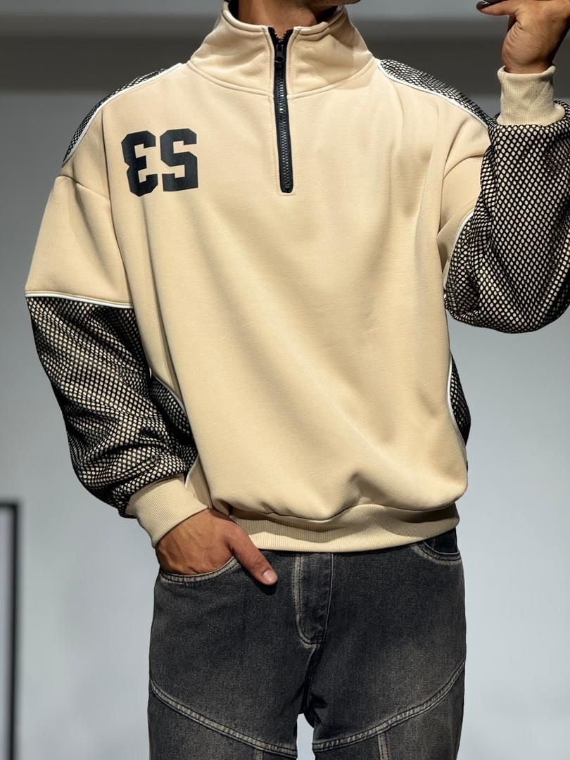 Un style sportswear moderne avec ce pull beige à col montant zippé.